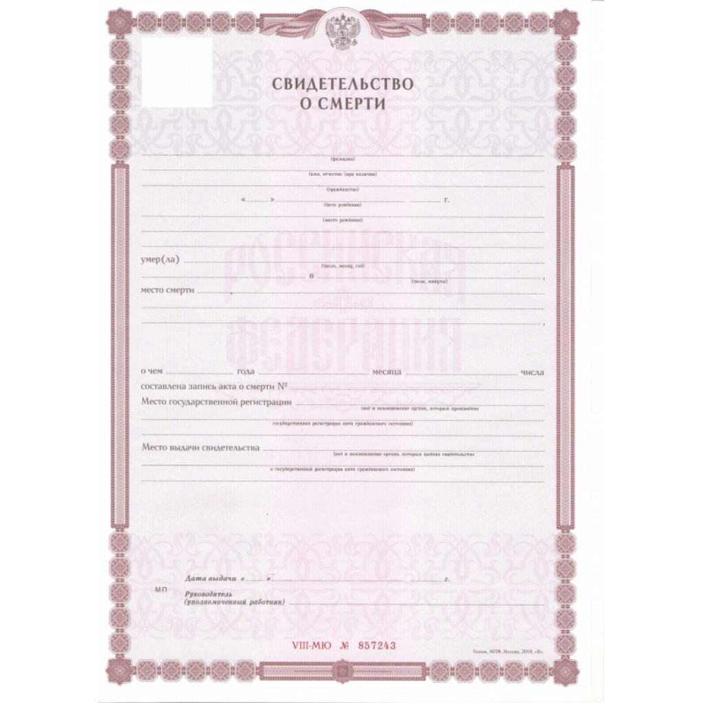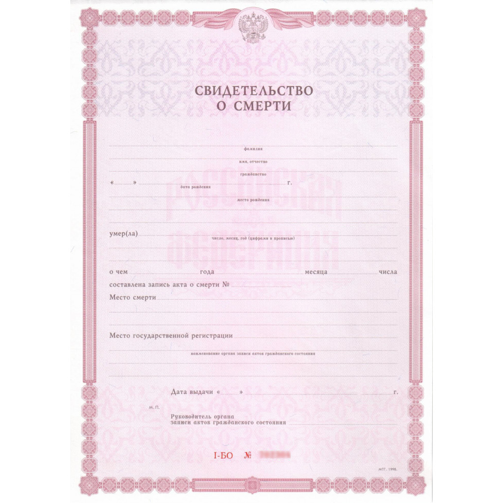 Настоящее медицинское свидетельство о смерти человека 2019-2024 годов купить очень просто! Нажмите "заказать в один клик" заполните необходимые поля и отправьте заявку, или позвоните по телефону. Мы гарантируем полную анонимность и оперативность изготовления.